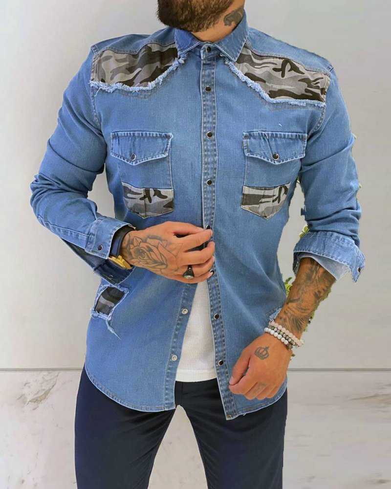 Popis produktu Svetlo-modrá pánska rifľová košeľa s maskáčom MR Chic XXL